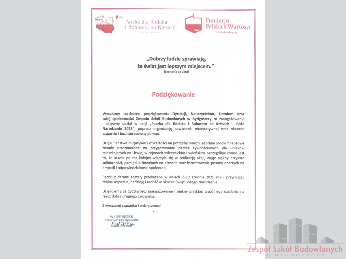 Z radością informujemy, że nasza szkoła otrzymała podziękowanie od Fundacji „Paczka dla Rodaka na Kresach” za udział w świątecznej akcji pomocy dla Polaków mieszkających na terenie Litwy.