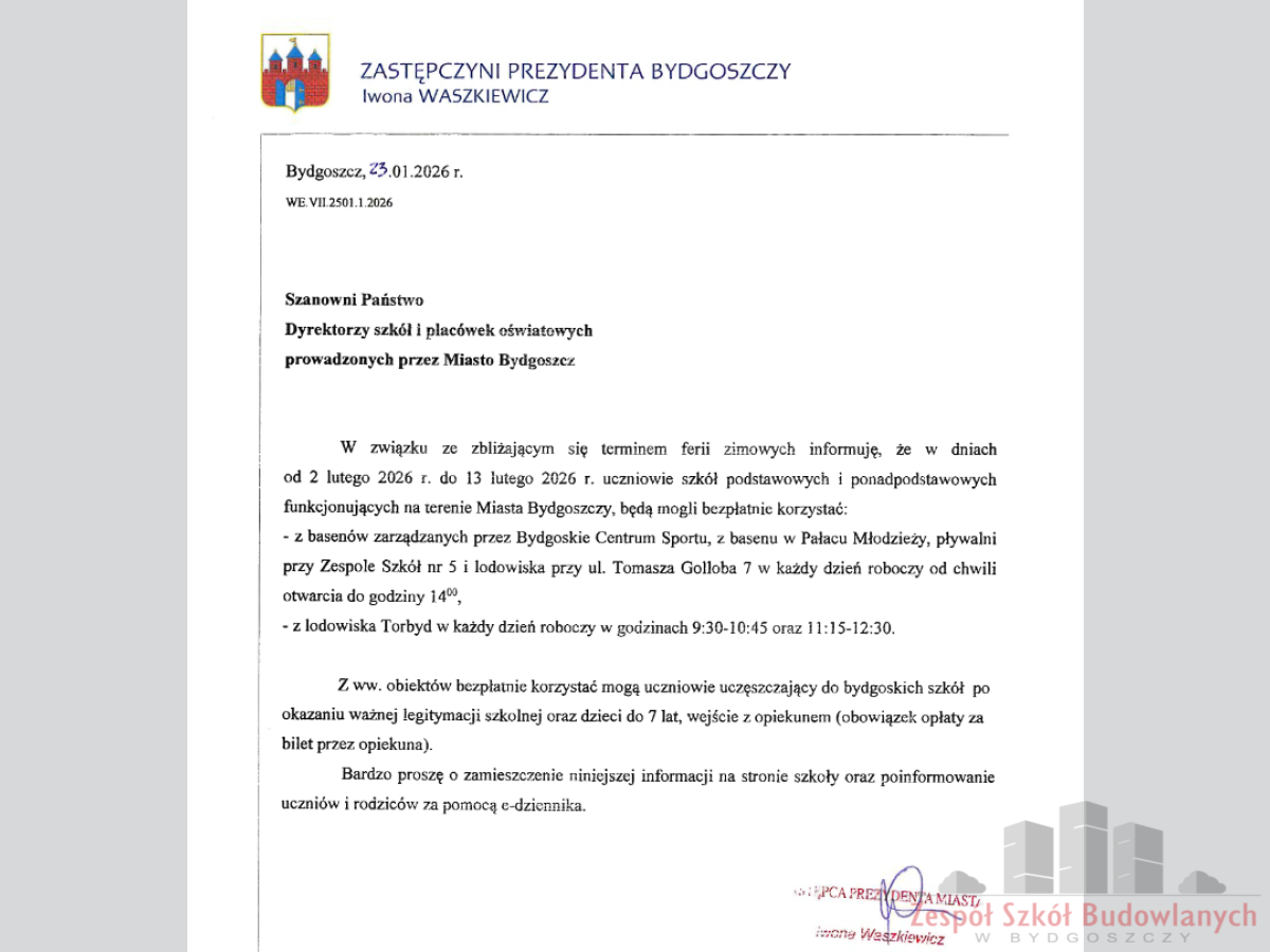 Pismo dotyczące bezpłatnego korzystania z basenów i lodowisk w czasie ferii zimowych dla dzieci i młodzieży z bydgoskich placówek oświatowych.