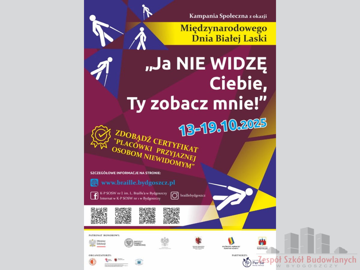 i codzienne problemy, z jakimi zmagają się osoby z dysfunkcją wzroku. Klasa 3 H formułowała list do dzieci z Kujawsko-Pomorskiego Specjalnego Ośrodka Szkolno-Wychowawczego nr 1 dla Dzieci i Młodzieży Słabo Widzącej i Niewidomej im. L. Braille’a w Bydgoszczy. Tym samym chcieliśmy wyrazić szacunek i wrażliwość na ich potrzeby. Cele, które zrealizowano to między innymi przygotowanie młodzieży do udzielania właściwej pomocy osobom z dysfunkcją wzroku, zauważenie ich problemów oraz zapobieganie wykluczeniu społecznemu osób z niepełnosprawnością wzrokową. Biała laska to narzędzie ułatwiające poruszanie się ale także symbol niezależności i godności osób niewidomych. PATRONAT HONOROWY nad kampanią objęli: Minister Edukacji, Instytut Pamięci Narodowej, Wojewoda Kujawsko-Pomorski, Marszałek Województwa Kujawsko-Pomorskiego, Kujawsko Pomorski Kurator Oświaty, Prezydent Miasta Bydgoszczy. PARTNER KAMPANII: Fundacja Per Se Rozwój i Edukacja.