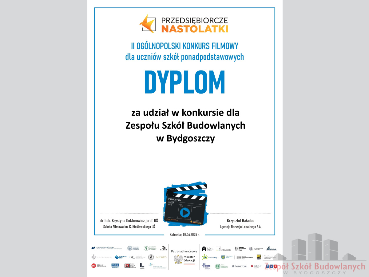 Biuro karier "Nowy horyzont" przy Zespole Szkół Budowlanych w Bydgoszczy informuje, że w roku szkolnym 2024/2025 uczniowie uczestniczyli w projekcie "Przedsiębiorcze nastolatki". Celem konkursu było nakręcenie oryginalnego filmiki promującego przedsiębiorczość. Uczniami, którzy wzięli udział: Dominka Pawlikowska, Róża Miller z klasy 2R oraz Julia Kulpa, Michał Kocikowski, Nina Sobolewska, Łukasz Magdziarz z klasy 4H. Gratulujemy zaangażowania i pomysłowości.