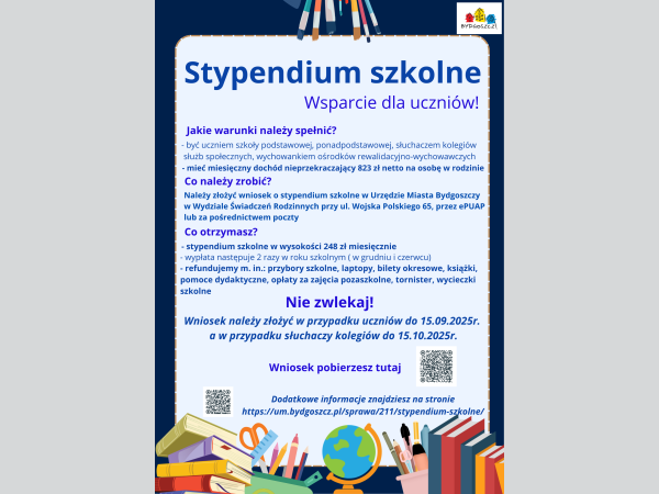 Wydział Świadczeń Rodzinnych Urzędu Miasta Bydgoszczy przekazuje plakat i ulotkę dot. stypendiów szkolnych.
