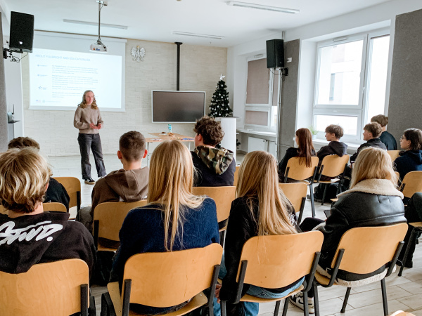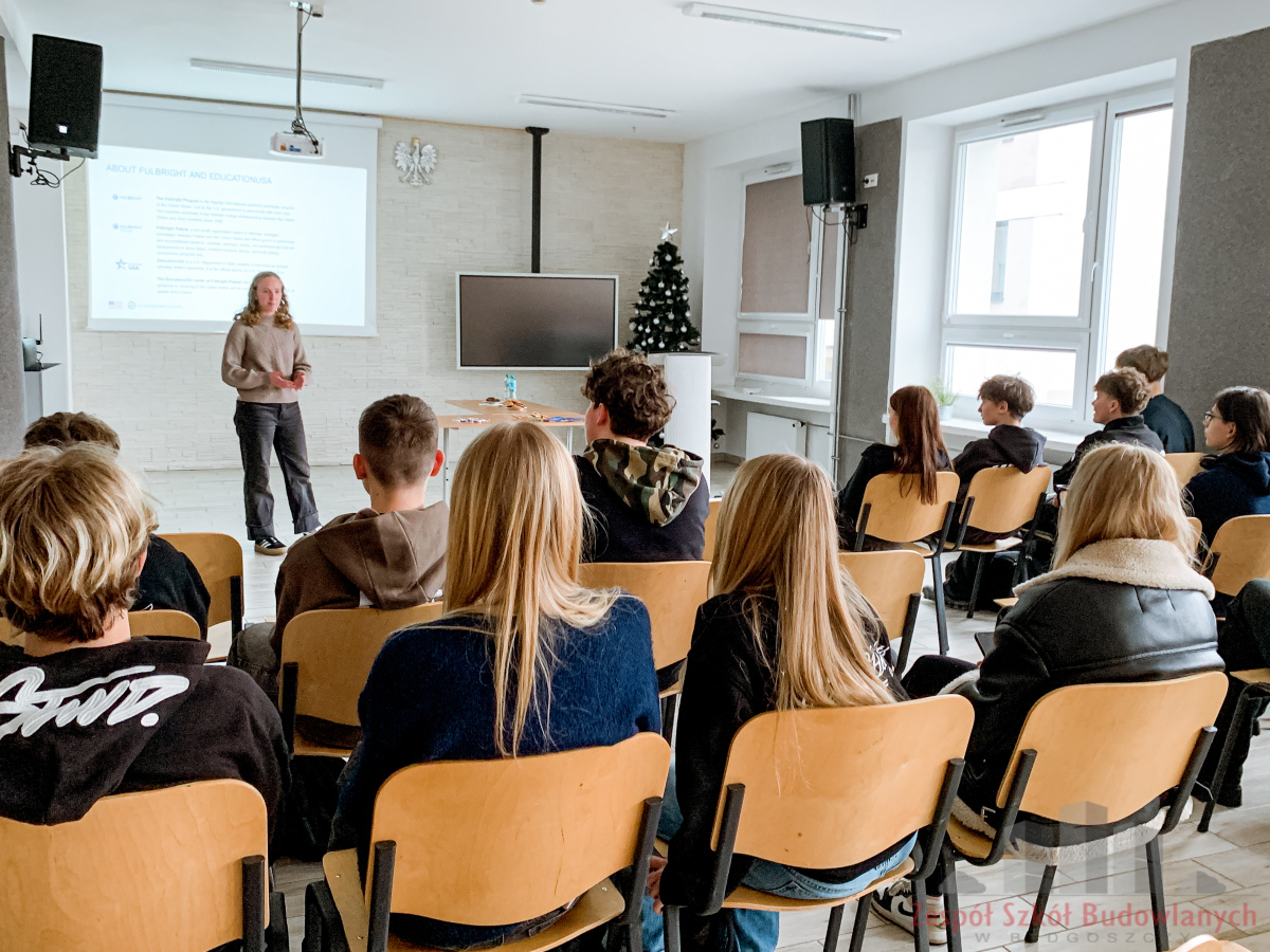 Uczniowie z dużym zainteresowaniem słuchali o amerykańskiej kulturze, szkole, codziennych zwyczajach i różnicach między USA a Polską. Nie zabrakło trafnych, czasem zaskakujących pytań, na które Caroline odpowiadała z humorem i otwartością. Szybko okazało się, że to nie był wykład, ale prawdziwa rozmowa – pełna ciekawości, śmiechu i wymiany doświadczeń.