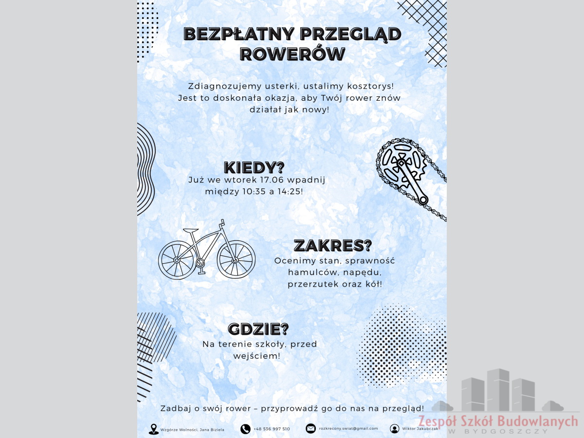 Serwis będzie prowadzony przez Wiktora, który od kilki lat zajmuje się diagnozą i naprawą rowerów, a dostęp do niego będą mieli wszyscy członkowie społeczności szkolnej. Dodatkowo otrzymasz diagnozę usterek i szacunkowy kosztorys.