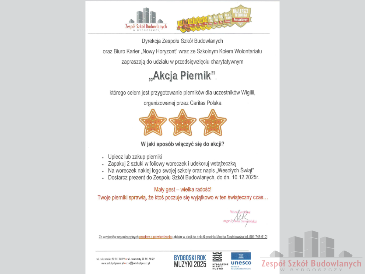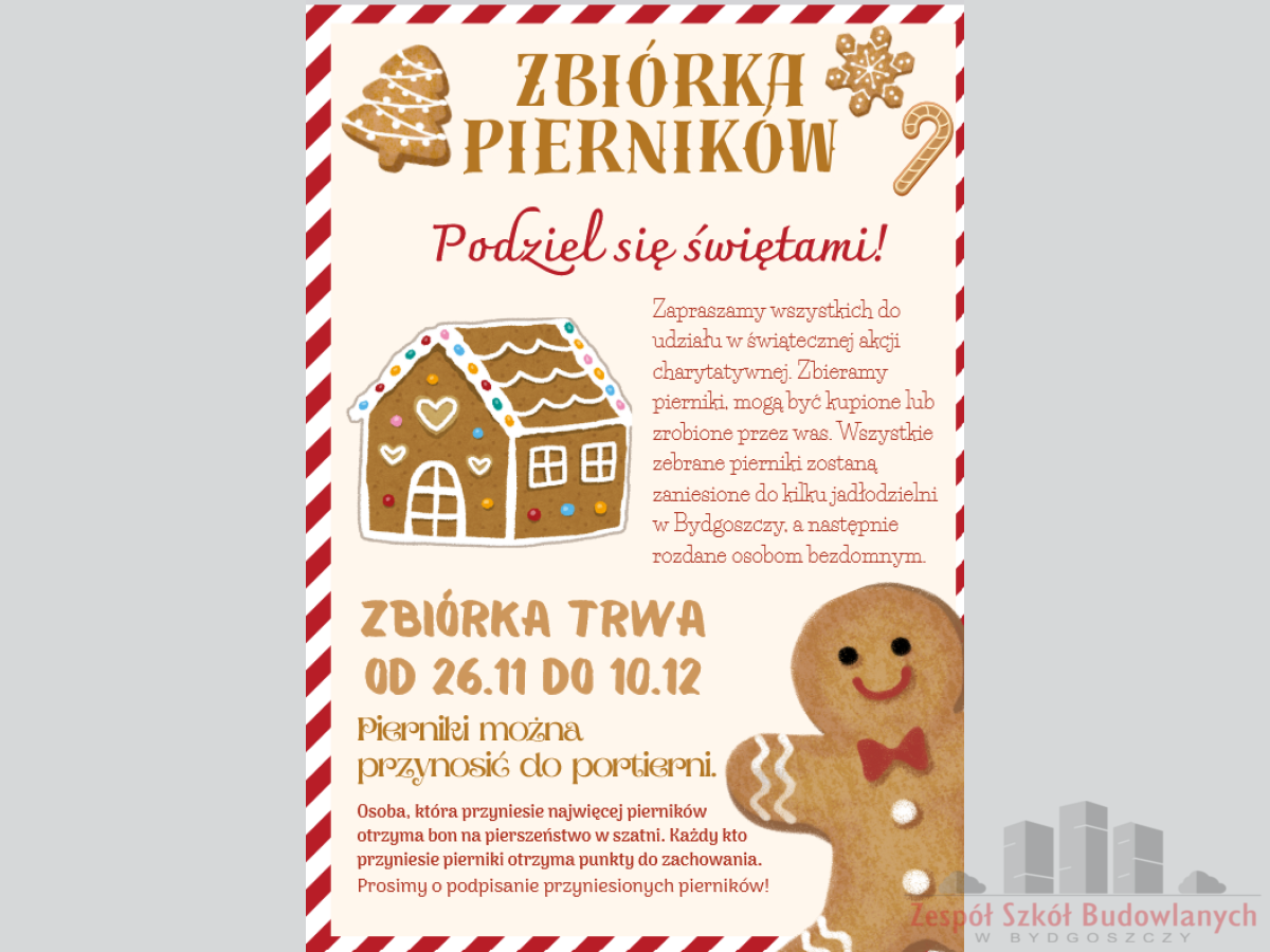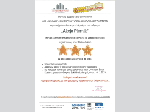W dniach 26 listopada – 10 grudnia 2025 roku odbywać się akcja pn. "Podziel się świętami - AKCJA PIERNIK", której celem jest zbiórka pierników dla osób potrzebujących. Zebrane pierniki zostaną przekazane do bydgoskich Jadłodzielni i na Wigilię organizowaną przez Caritas.