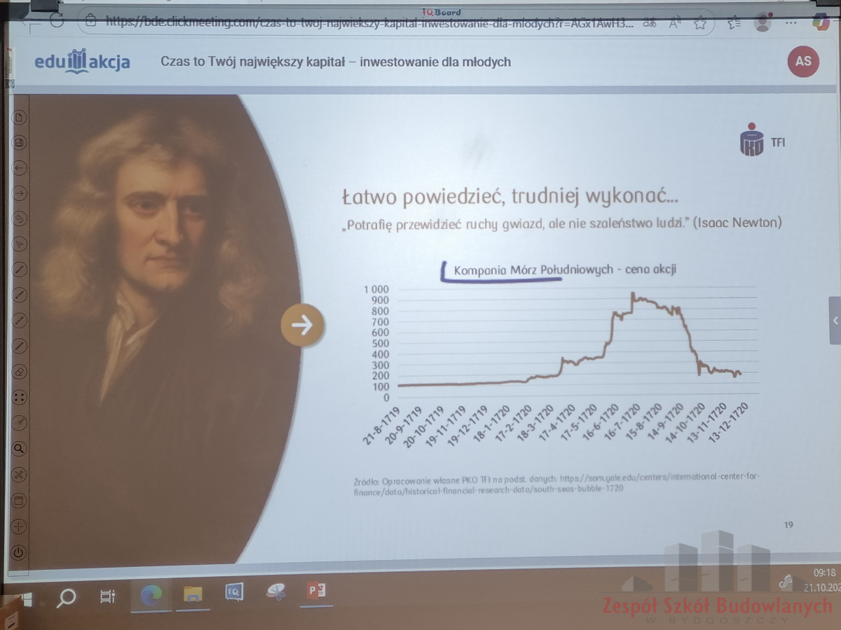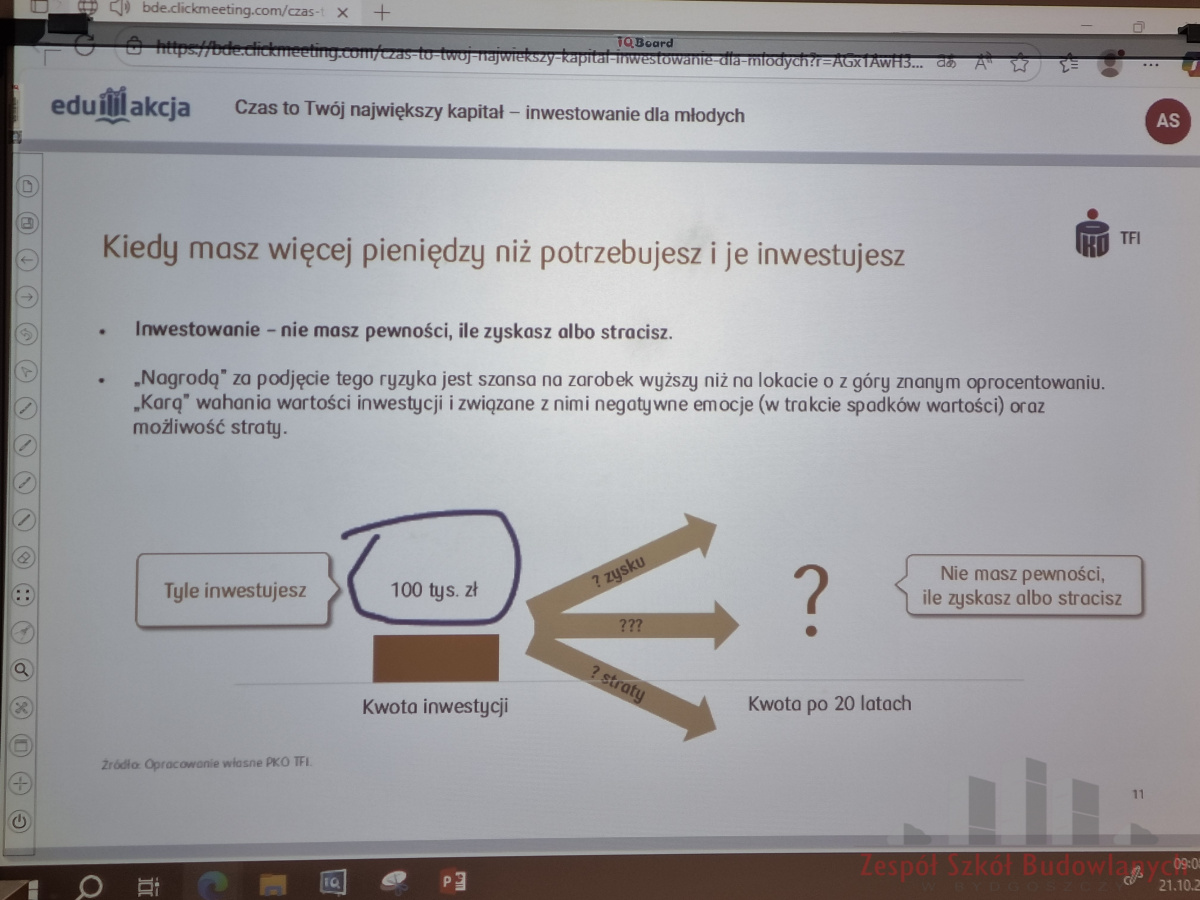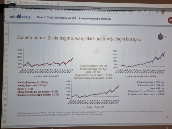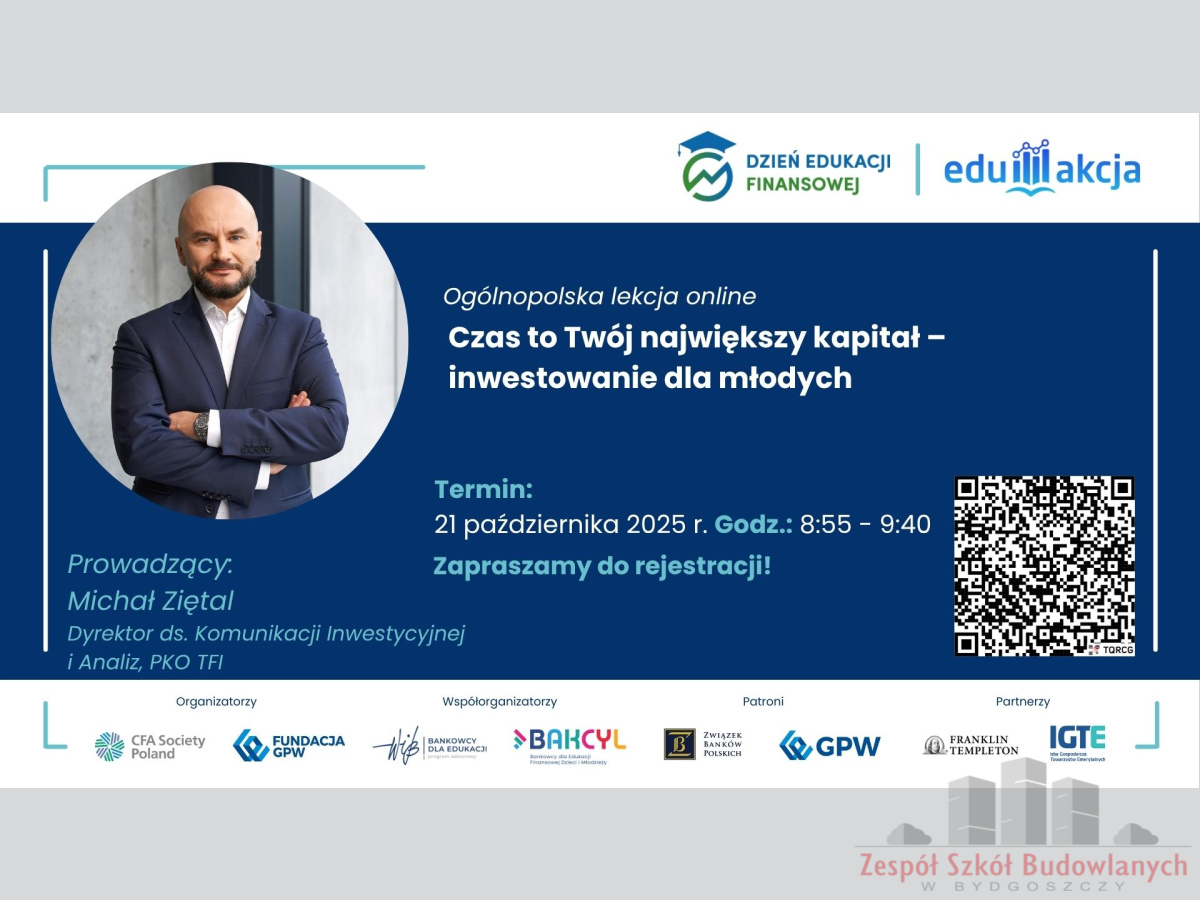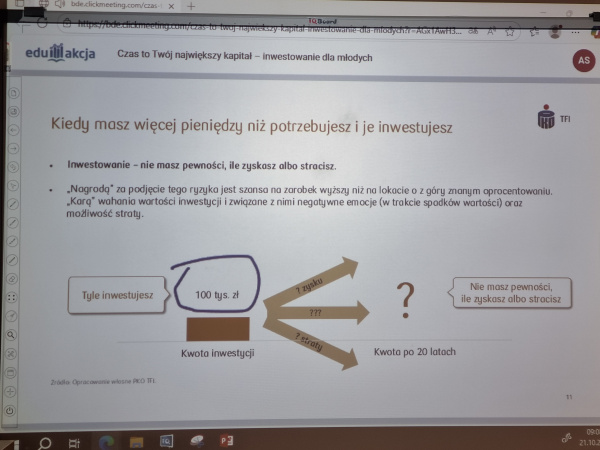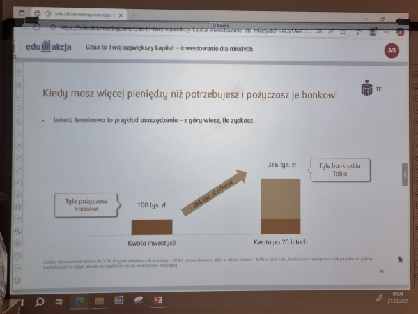 Z okazji Dnia Edukacji Finansowej grupa uczniów z klasy 1m uczestniczyła w spotkaniu online z praktykiem: „Czas to Twój największy kapitał – inwestowanie dla młodych".