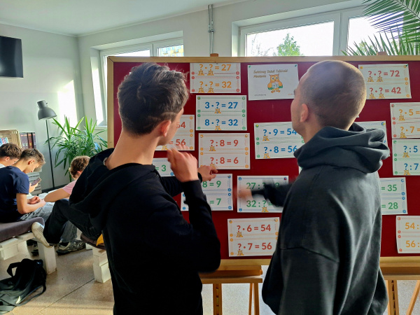 Na dużych przerwach uczniowie wcielili się w egzaminatorów i odważnie przepytywali swoich kolegów oraz wszystkich napotkanych nauczycieli. Każdy, kto poprawnie odpowiedział na pytania z tabliczki mnożenia, mógł zdobyć specjalny certyfikat – a chętnych do tego wyróżnienia nie brakowało!