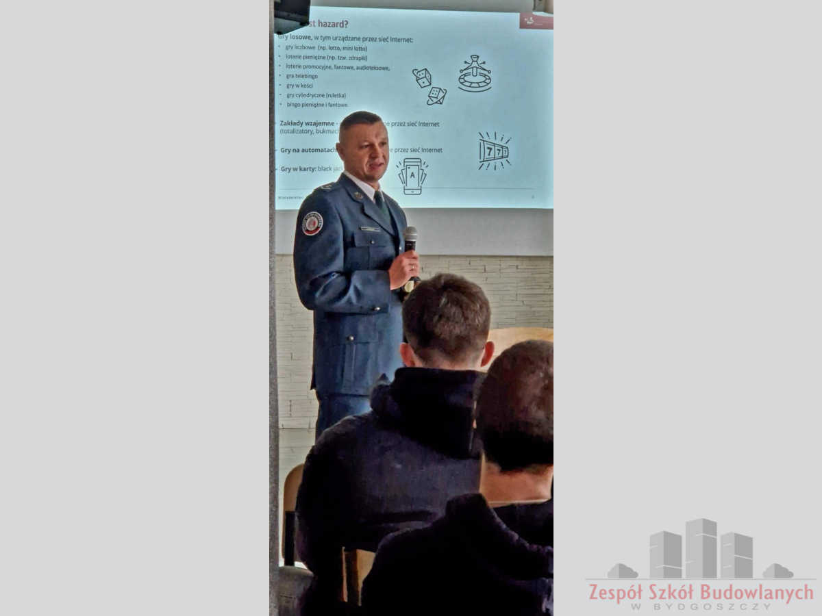 W środę 12.11.2025 przedstawiciele bydgoskiej Delegatury Kujawsko-Pomorskiego Urzędu Celno-Skarbowego, przeprowadzili wykład dla uczniów w ramach akcji „HAZARD? NIE DAJ SIĘ WCIĄGNĄĆ!”. Uczniowie mieli okazję dowiedzieć się czym jest przestępcza działalność hazardowa, jak się przed nią uchronić, jakie konsekwencje karne wynikają z jej uprawiania, a także czym jest uzależnienie od hazardu i jakie są jego konsekwencje.