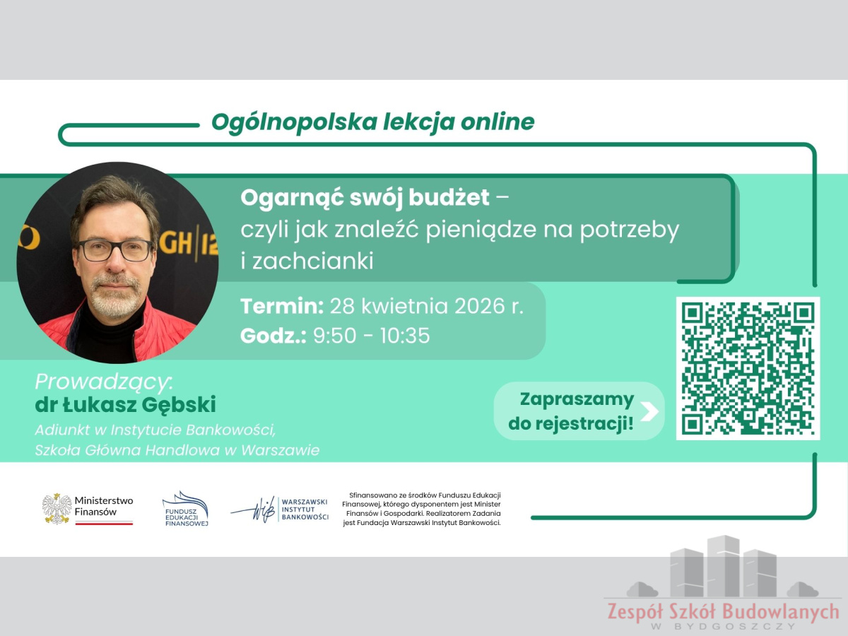 Wydarzenie odbyło się 28 kwietnia 2026 r. i było poświęcone podstawom zarządzania finansami osobistymi. Lekcję poprowadził dr Łukasz Gębski, adiunkt w Instytucie Bankowości Szkoły Głównej Handlowej w Warszawie.