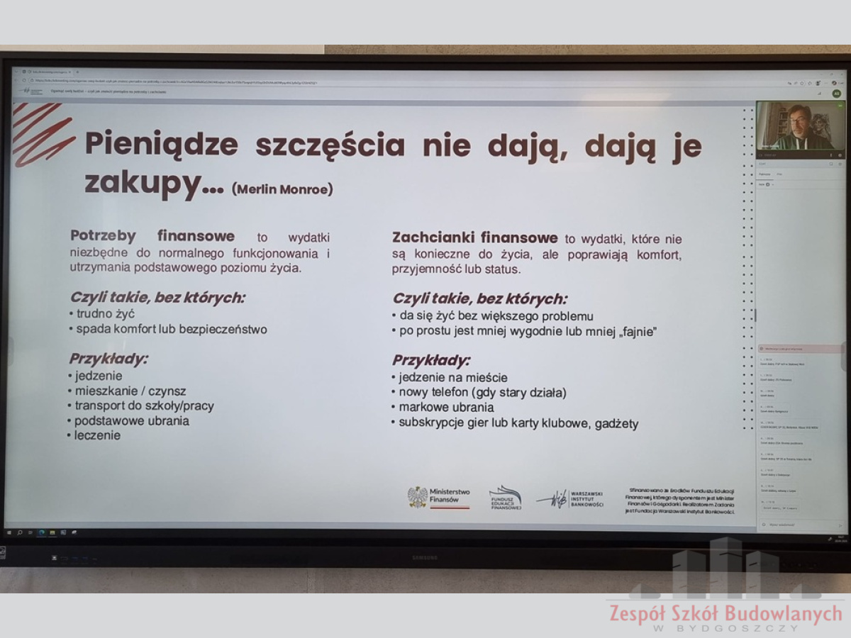 W trakcie spotkania wyjaśniono również różnicę między potrzebami a zachciankami, omówiono znaczenie planowania finansowego, tworzenia poduszki bezpieczeństwa oraz wyznaczania celów finansowych w krótkim i długim okresie. Uczniowie poznali także pojęcia nadwyżki i deficytu budżetowego.