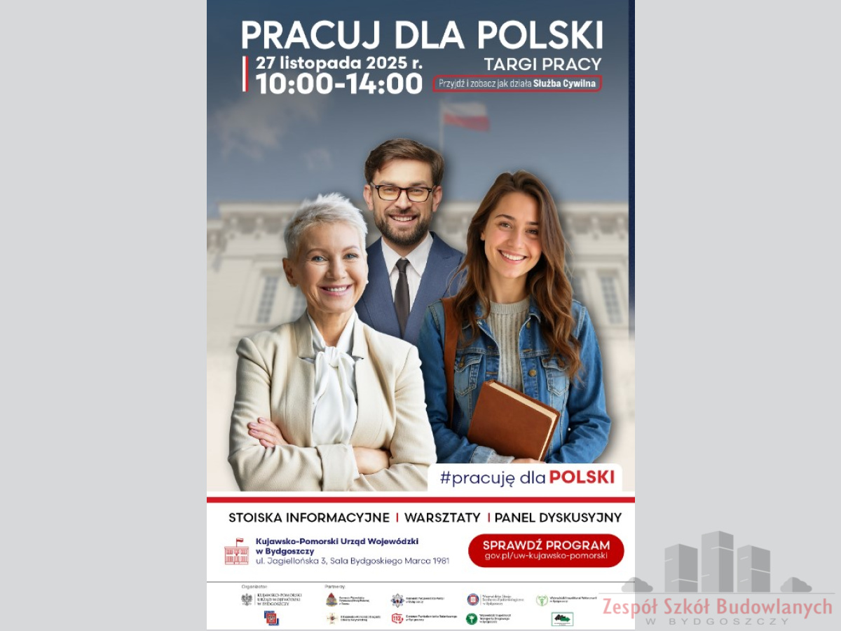 Biuro Karier "Nowy Horyzont" informuje o targach pracy organizowanych przez Kujawsko-Pomorski Urząd Wojewódzki w dniu 27 listopada. Hasło, które towarzyszy temu wydarzeniu to #pracujdlaPolski.