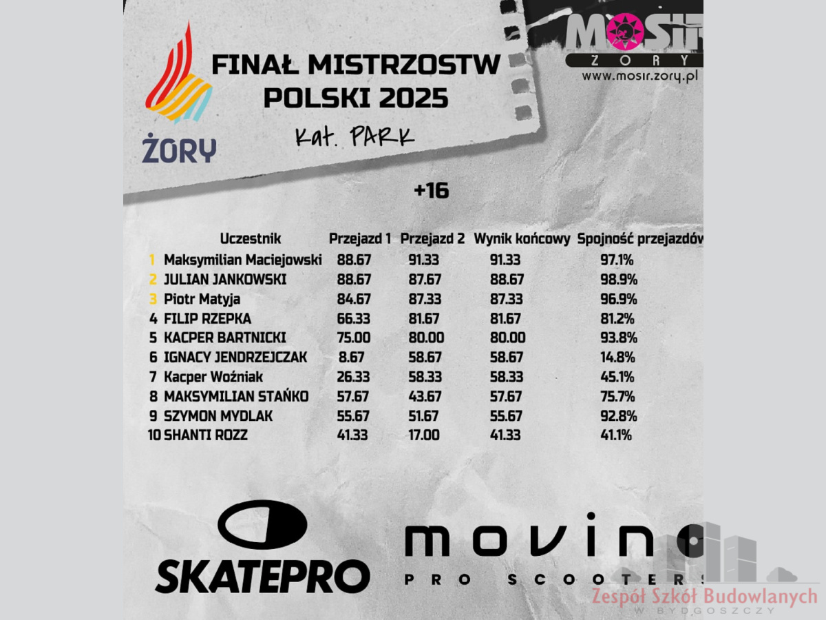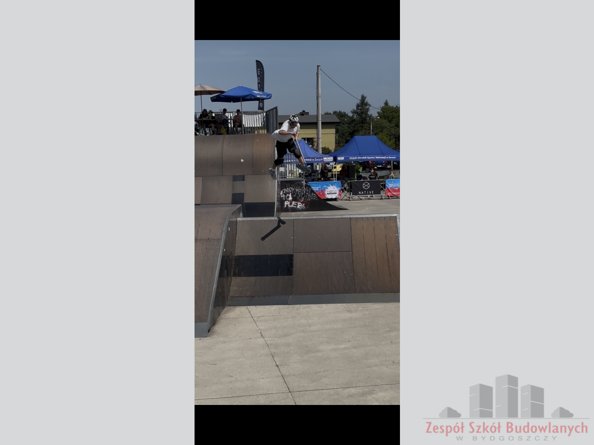 Dnia 09.08.2025 Ignacy J. wystartował w mistrzostwach Polski w wyczynowej jeździe na hulajnodze, w których zajął 6 miejsce w kategorii +16. Od pięciu lat samodzielnie ćwiczy i doskonali swoje umiejętności na terenie bydgoskich skateparków. Cechuje go ambicja i zdyscyplinowanie. Sukcesywnie rozwija swoje umiejętności. Gratulujemy. Trzymamy kciuki za dalsze sukcesy.