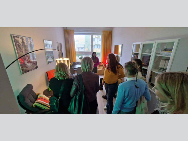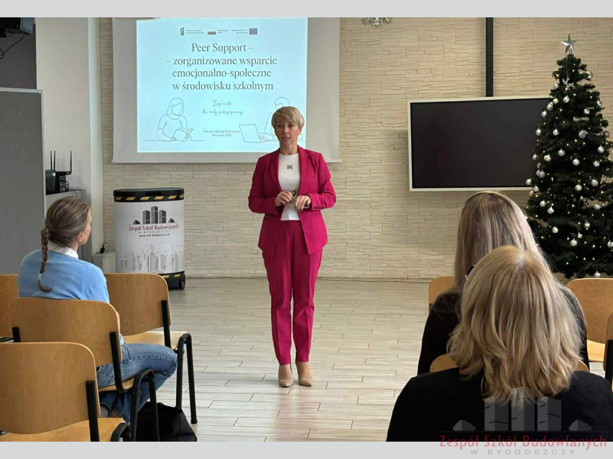Pani dr Kinga Sobieralska- Michalak przedstawiła kluczowe informacje dotyczące projektu Peer Support, w którym Zespół Szkół Budowlanych bierze udział.