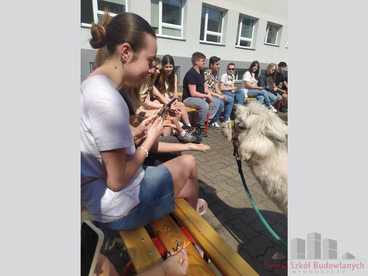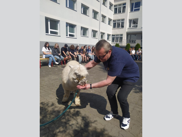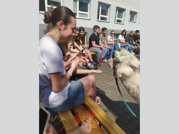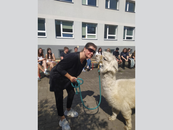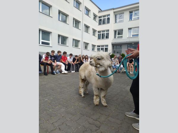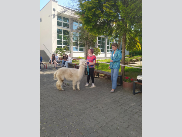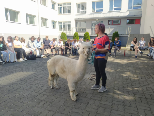 W środę uczniowie mieli możliwość bliskiego kontaktu ze zwierzętami: alpaki Lambady, psa Lajki oraz kameleona i agamy. O ich życiu opowiedziała Pani Katarzyna Strehl, zajmująca się hodowlą alpak oraz wykorzystywaniem ich w terapiach z dziećmi i dorosłymi.